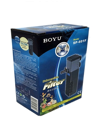 | BOYU suitable for water pumping ,water circulation in various aquariums,oxygen adding for aquatic pets & filtering .modelSp- 601F, voltage Ac230/115v, power 6w ,Hmax 0.6M,Q max 340L/H,fear 50/60HZ weight 0.25kg , Size 135*48*74mm |